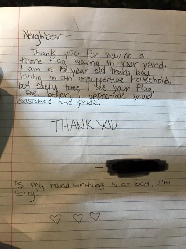 utah’da bir kadın evinin dışına trans bayrağı astı ve sonrasında aldığı mektup gözyaşları içinde bıraktı. salt lake city’de yaşayan audrey, evinin önüne trans bayrağı astıktan sonra gelen bir mektubu reddit’te bir lgbt grubunda şu sözlerle paylaştı: “kapımın önüne bırakılan bu mektubu okurken göz..